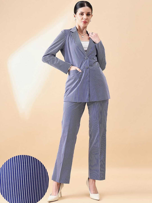 Blue-Striped Asymmetric Blazer With Tailored Elasticated Fit Trouser