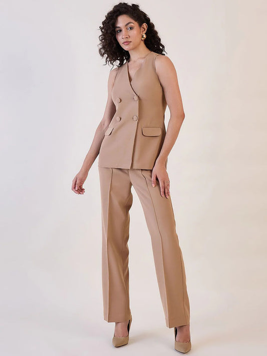 Lapel less Stretch Pant Suit- Chocolate Brown