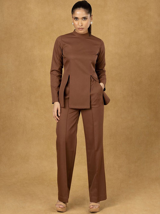Brown Front Slit Top With Straight Trouser