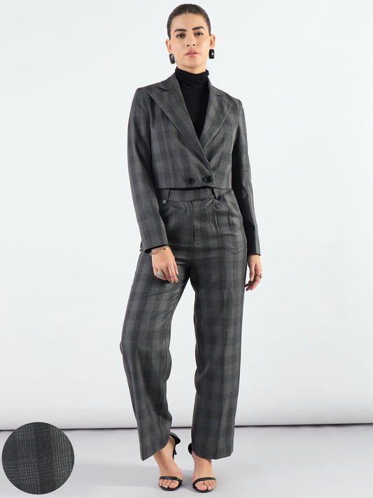 Stylish Grey Notched Lapel Checkered Warm Crop Blazer With Trouser