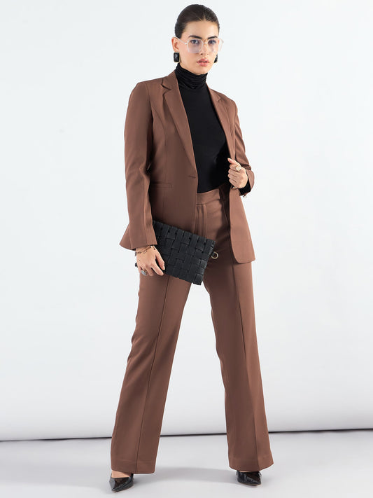 Brown Notched Lapel Blazer With High-Waist Trouser In Stretchable Fabric