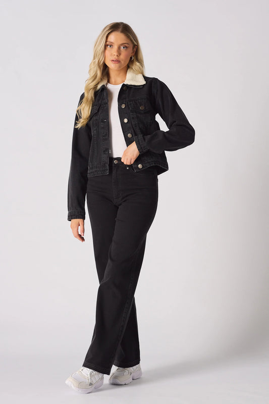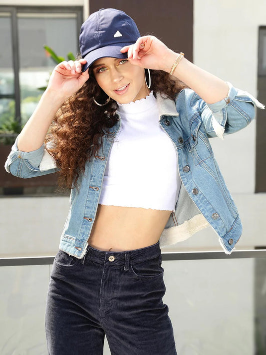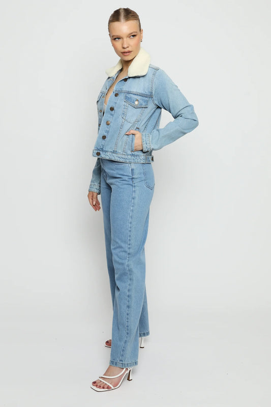 Sherpa Collar Women Denim Jacket - Mid Blue