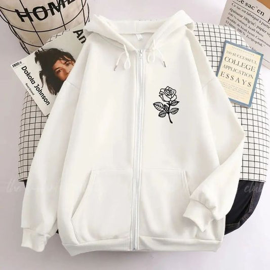 White Rose Fleece Full Seeves Zipper Hoodie For Women