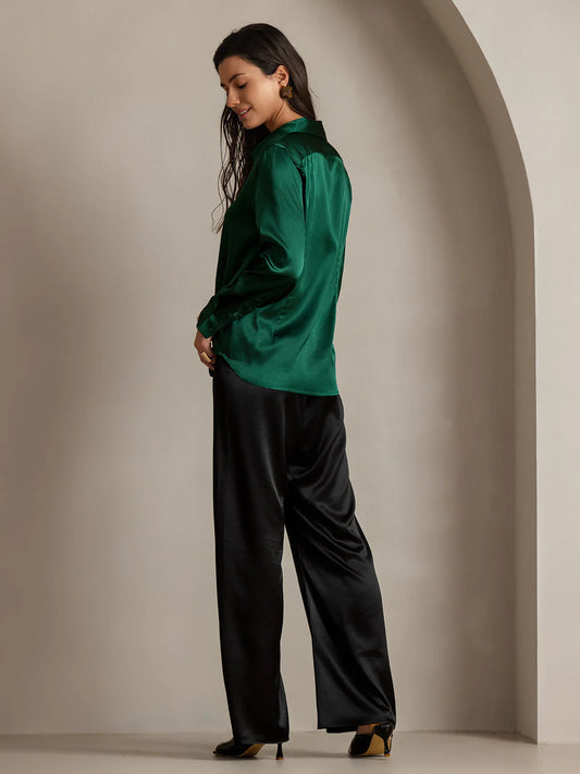 Dark Green Silk Long Sleeve Lapel Collar Women's Shirt