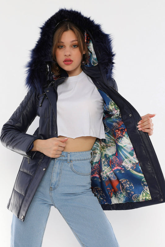 Caroline Tan Hood Long Leather Jacket Fur Collar