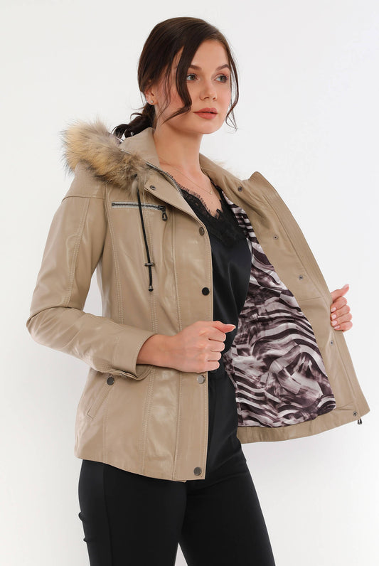 Chloe Maroon Fur Hood Leather Jacket For Women
